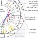 Partner (Uranus at 7° - the Libra degree - and degree of marriage or business partner). Mars, ruling the perpetrator indicates the killer could have reddish hair, works in construction, sports or be a police or fire fighter.